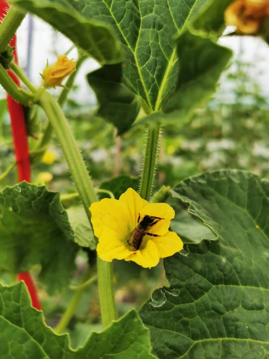 針對扶貧村土地及氣候特性,公司對當地種植品種及種植技術進行優化調整,以種植生產黃金蜜瓜(上茬)+豆丹養殖(下茬)+豆角種植為主產業,試作蒜苗+菠菜間套作復種模式。其中黃金蜜瓜平均畝產5000斤以上,豆角平均畝產4000斤以上,豆丹平均畝產達180斤以上。在黃金蜜瓜種植期間首次采取單株雙果,蜜蜂試驗授粉種植管理模式,實現了全程綠色種植,甜瓜長勢茂盛,個頭碩大,均能達到單頭3斤以上,彌補了全國6-7月份黃金瓜市場品種空白,創造了較好的經濟及社會價值。