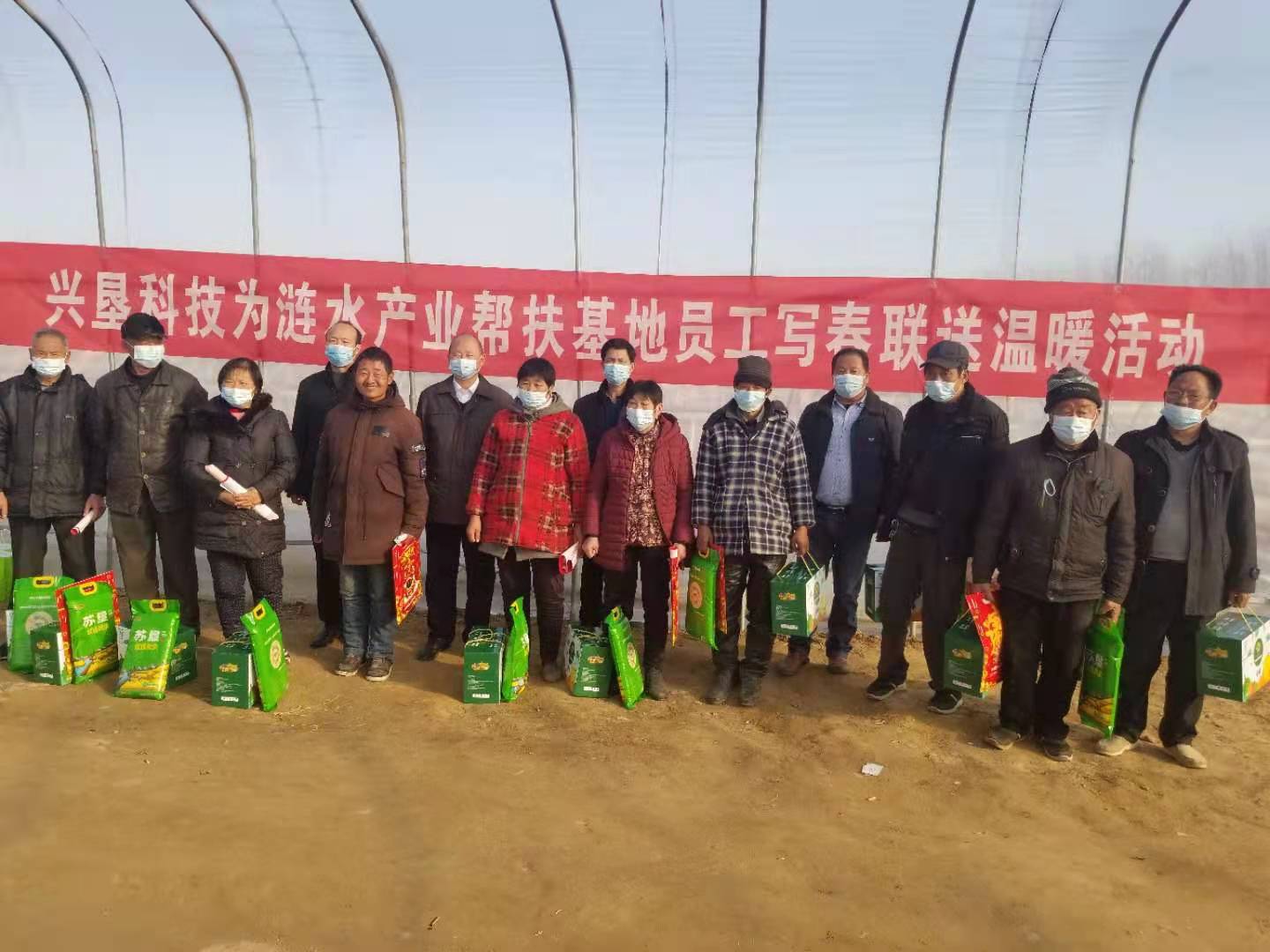 春節(jié)將至,幫扶情深。2021年2月4日下午,江蘇農(nóng)墾興墾農(nóng)業(yè)科技有限公司董事長、總經(jīng)理陳叢林、副總經(jīng)理?xiàng)钣濉ⅠR傳武一行到漣水產(chǎn)業(yè)幫扶基地開展寫春聯(lián)送溫暖慰問活動(dòng),為基地村民送上組織的關(guān)懷和新年的祝福。漣水縣林場村支部書記陳法寶一同參加慰問活動(dòng)。