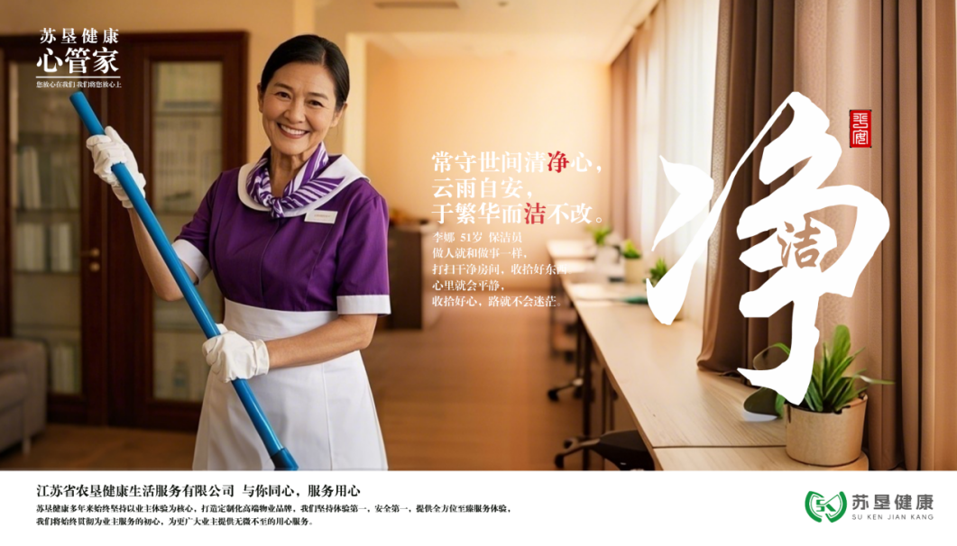 蘇墾健康制定嚴謹?shù)谋嵙鞒膛c標準,從公共區(qū)域的日常清掃、垃圾清運,到各專間的深度清潔、消毒除臭,每個環(huán)節(jié)都嚴格把控。配備先進清潔設(shè)備與環(huán)保清潔用品,確保服務(wù)區(qū)域始終整潔、明亮,為業(yè)主帶來舒適的視覺與體感體驗。